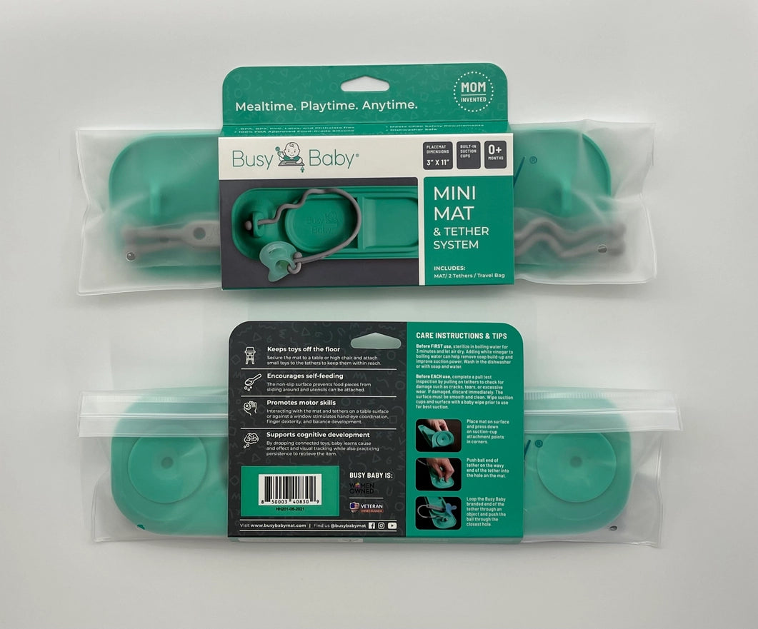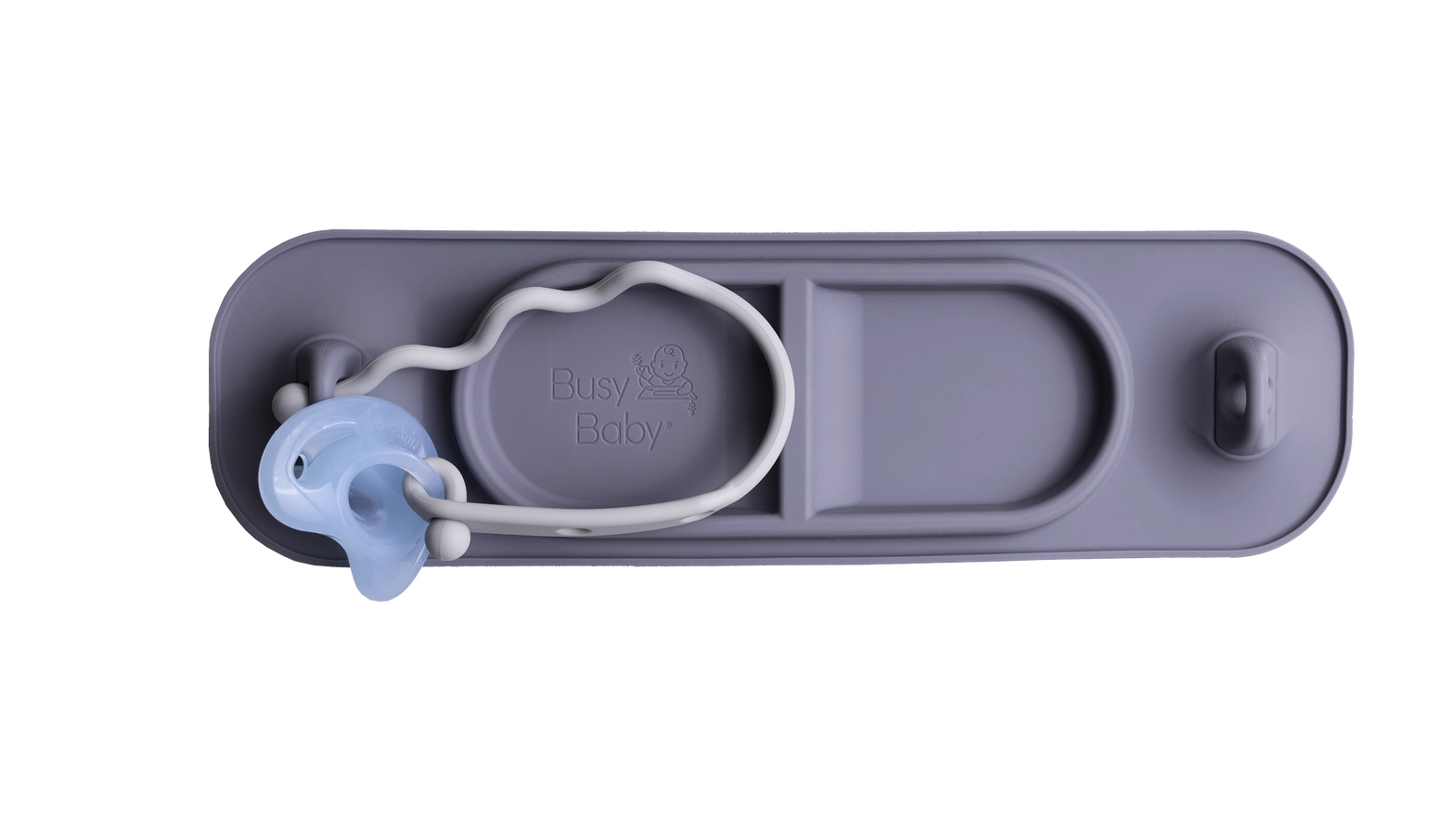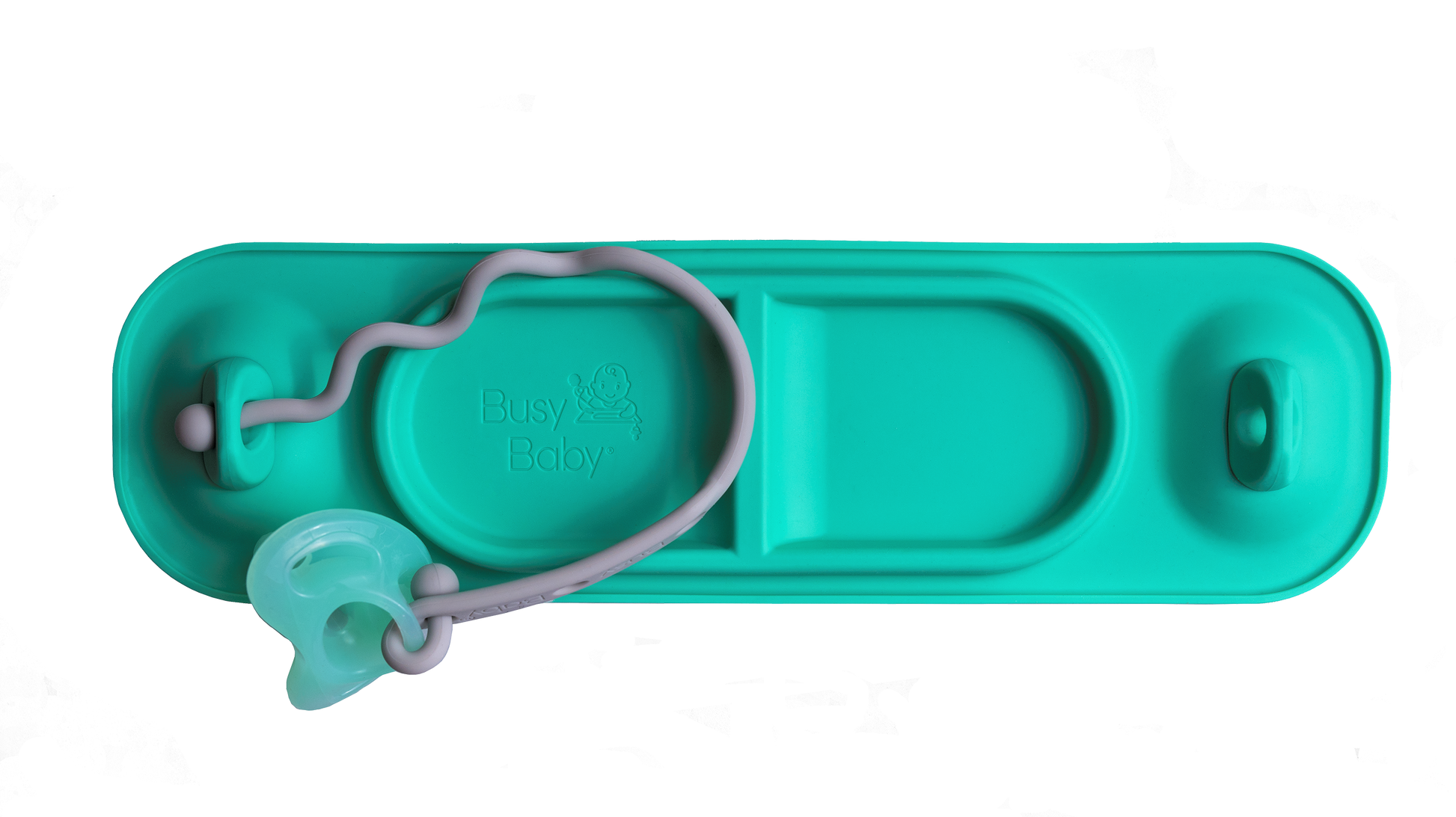 Perfect for small high chairs and travel trays, the Busy Baby Mini Mat is 1/3 the size of the original mat and contains a divided tray for food with a 3rd suction cup embedded on the bottom.  It measures 11 inches X 3 inches.
