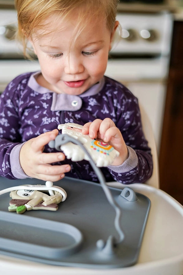 This baby Alpaca teether is a fan favorite! Easily connects to the Busy Baby Mat with our patented tether system to ensure your child has their favorite toy always within reach. This adorable teething toy is designed with a multi-texture surface, easy grip for your baby’s small hands, and is hypoallergenic and dishwasher safe.