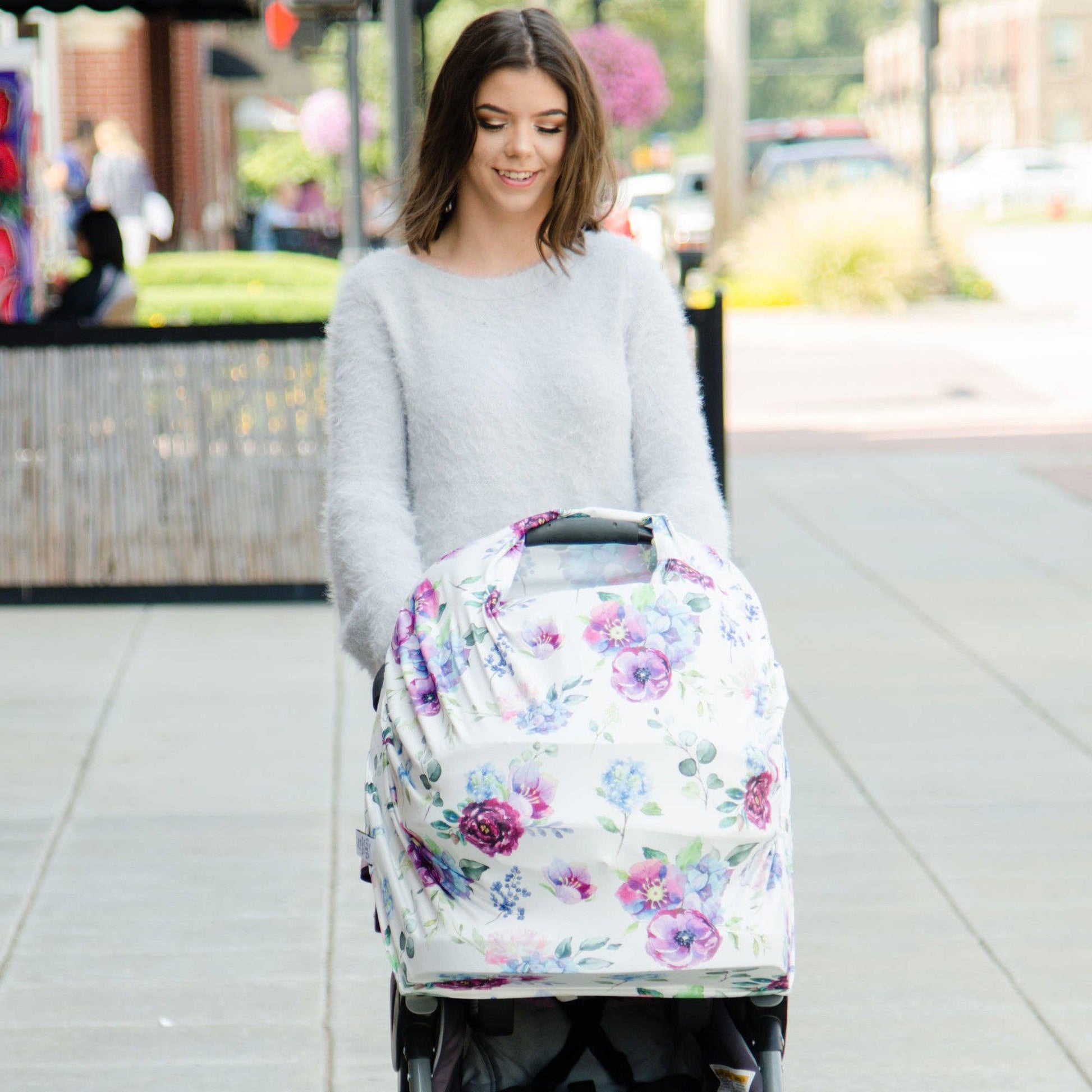 This BEAUTIFUL blue floral car seat cover is made with our own unique print! It's SUPER SOFT and stretchy and can be used as a car seat cover, nursing cover, highchair cover, grocery cart cover, or an infinity scarf when not being used! The opening on top of the car seat makes it easy to check on your baby when needed while providing great protection from the sun or strong wind. When being used as a nursing cover, it covers 360 degrees so you don't need to worry about the wind or having to constantly adjust the angle. Details: - Rayon 95% / Spandex 5% blend. - Machine wash cold and tumble dry at low heat. - Each cover is packaged in a polybag.