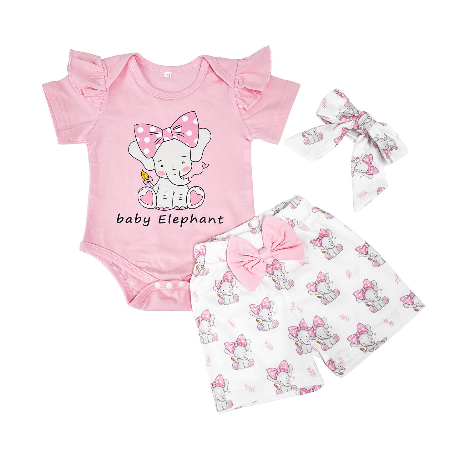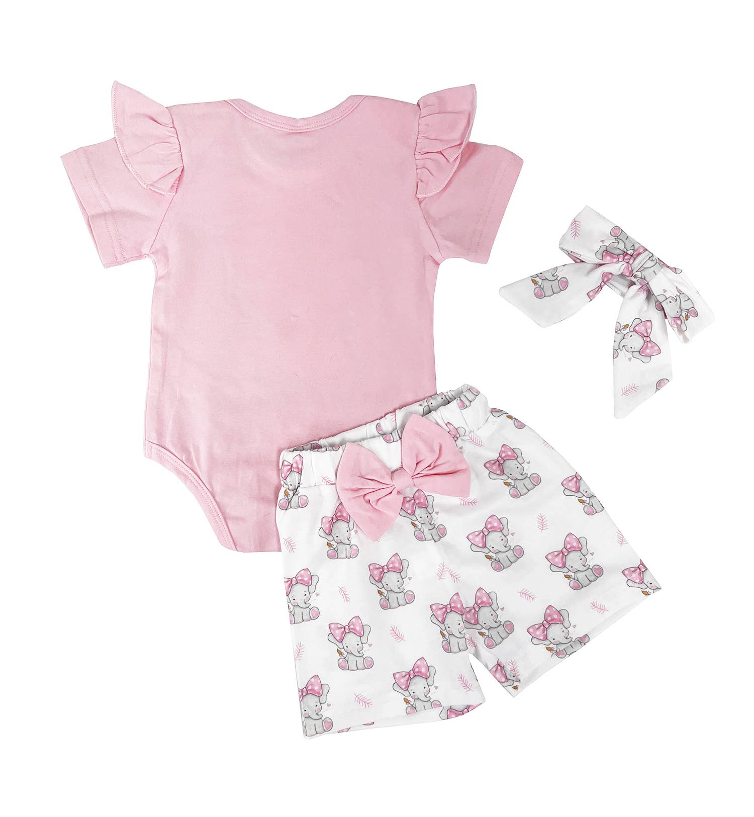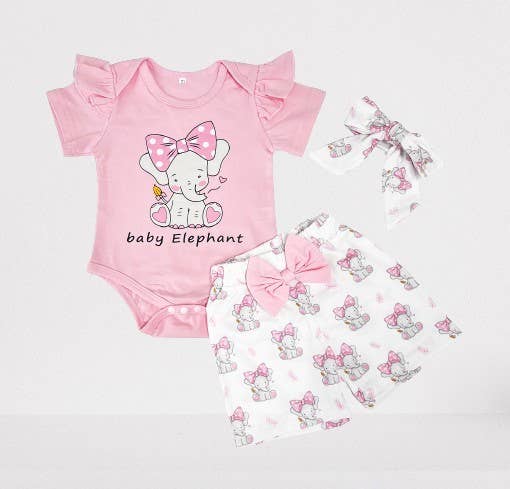 Elephant Pink Bodysuit, Shorts & Headband 3pcs Baby Girl Set