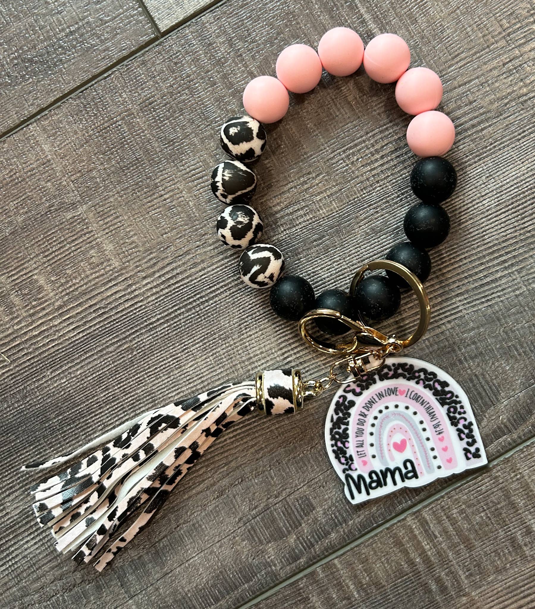Celebrate your faith and style with our Mama Pink Leopard Keychain featuring a heartfelt Bible verse. Crafted with soft silicone beads in a chic pink leopard pattern, this keychain includes a tag inscribed with 1 Corinthians 16:14: "Let all you do be done in love."