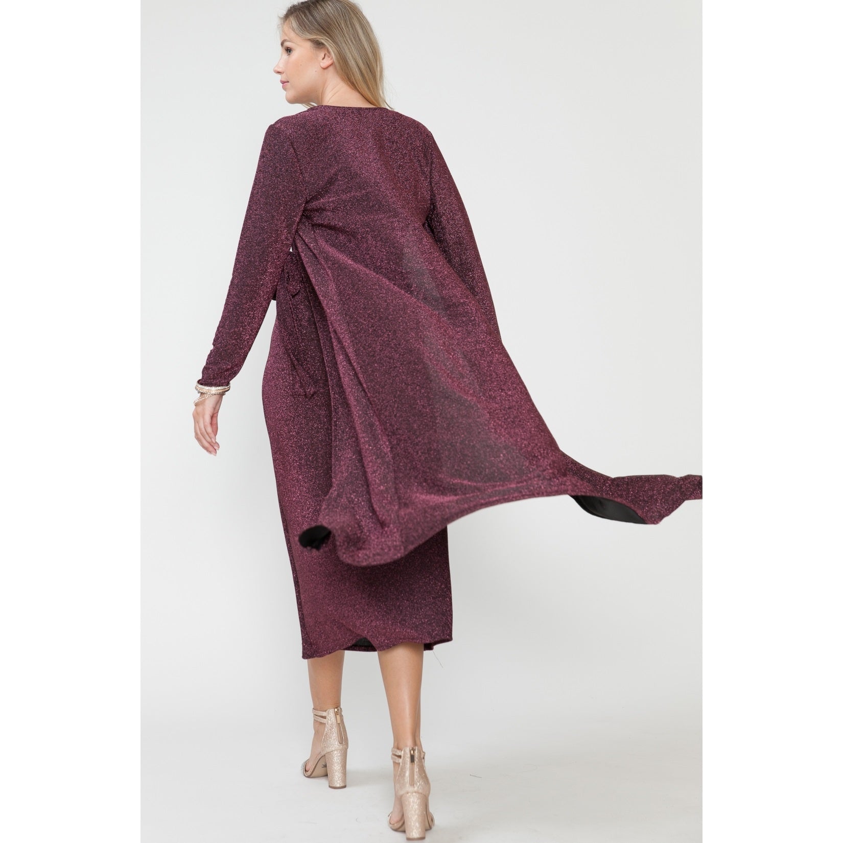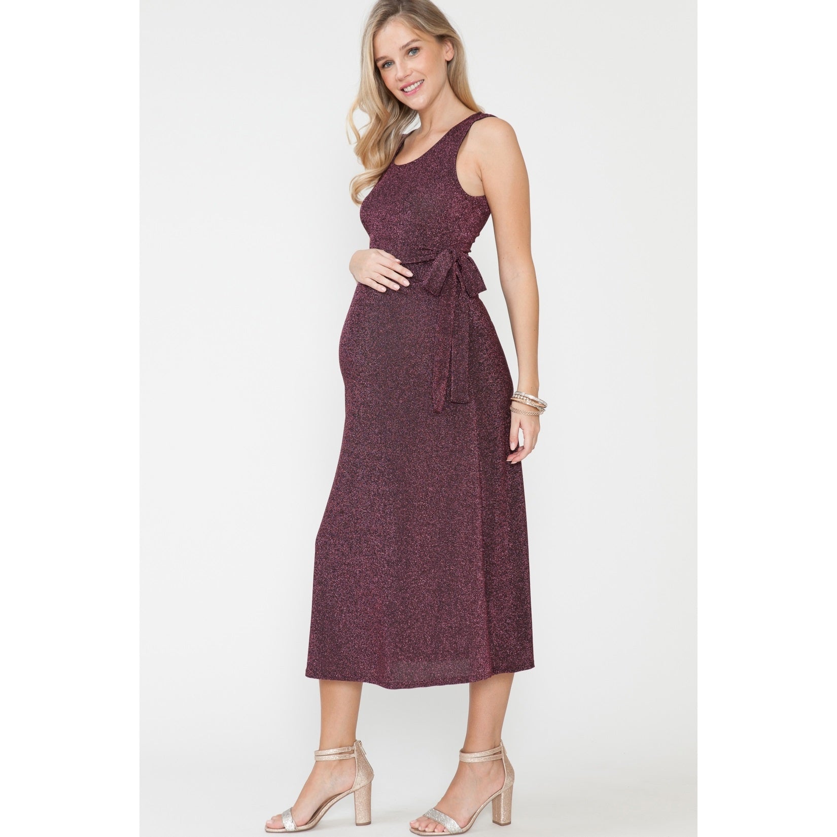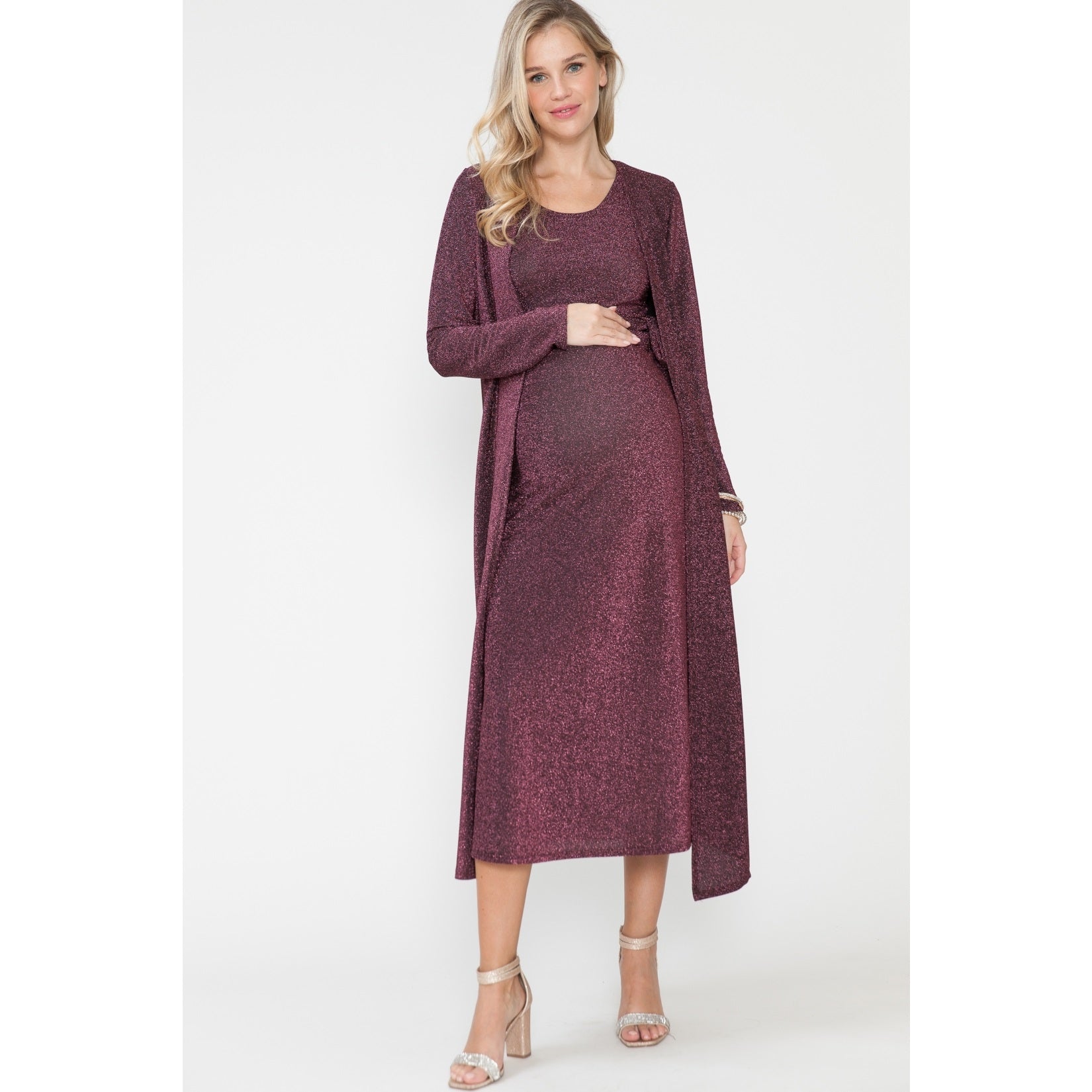 AD9438M-SET Women's Maternity Holiday Midi Skirt & Cardigan Tank Top Waist Tie 3 Pcs Set Knit Metallic 56% Poly 35% Lurex 9% Span.ma Model size - Height: 5'9", Bust: 32", Waist: 23", Hips: 35", Cup: B, Dress:2, Shoe: 8 True to Size, Hand Wash Cold, Tumble Dry, Made in Mexico