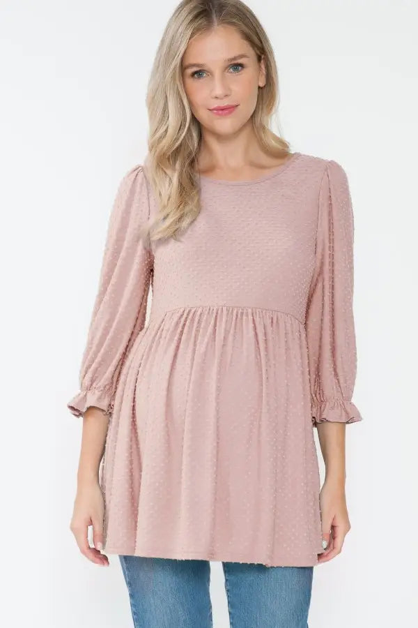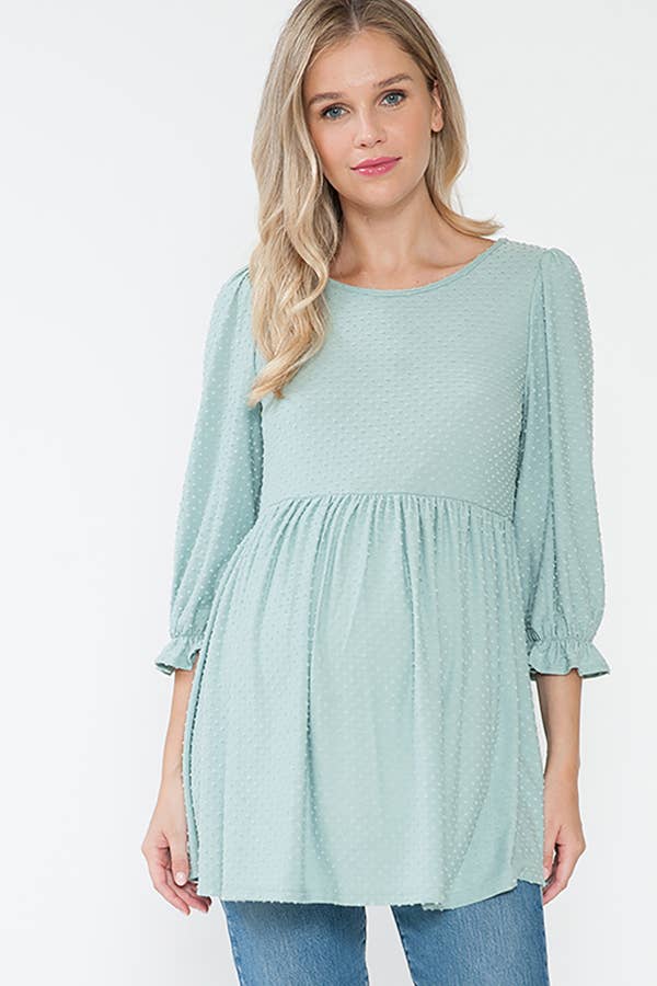 Puff 3/4 Sleeve Waist Ruche Maternity Baby Doll Top Rayon Clip Dot 95% Rayon 5% Spandex. Colors: Seafoam, Blush, Natural