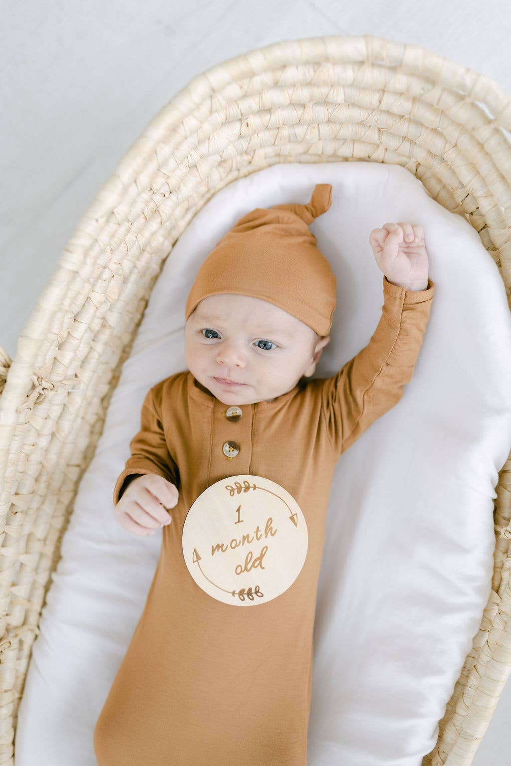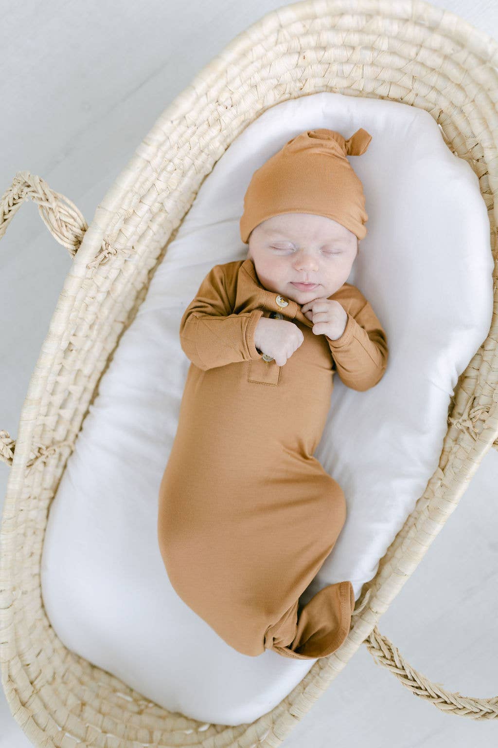 Our Camel Brown Knotted Baby Gown and Set is crafted from a luxurious blend of fabric, ensuring buttery softness for your clientele. This ultra-soft newborn baby clothing features built-in no-scratch mittens, safeguarding a baby's delicate face from fingernail scratches. With convenient working buttons, dressing babies becomes a breeze, while the knotted bottom of the gown simplifies diaper changes. This adorable baby clothing set is perfect for newborns up to 3 months old. If you need baby boy clothes or baby girl clothes for your shop, look no further than Stroller Society's collection of newborn baby knotted gowns, baby hats and baby bows. This premium baby clothing line ensures comfort and style for your customers' little ones. Add these baby gifts to your inventory for a hot-selling item! This popular color also comes in a top and bottom outfit, making it an ideal choice for baby clothing. Our baby clothes are designed to cater to the needs of both babies and parents.
