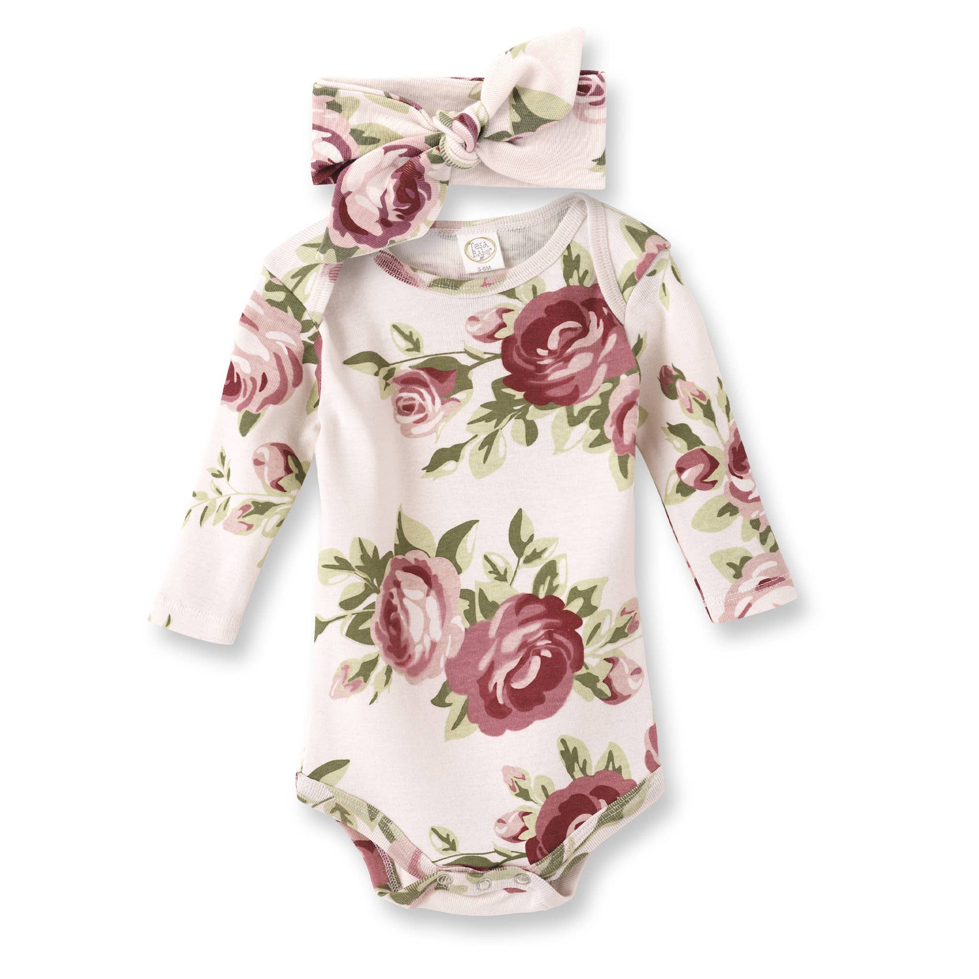 Baby girl Cabbage Rose Bodysuit & Headband Set. Soft and stretchy 100% cotton rib material is oh-so-gentle against baby's skin. Bodysuit has envelope neck and snaps underneath for easy on and off. Headband can be re-tied for optimum fit.