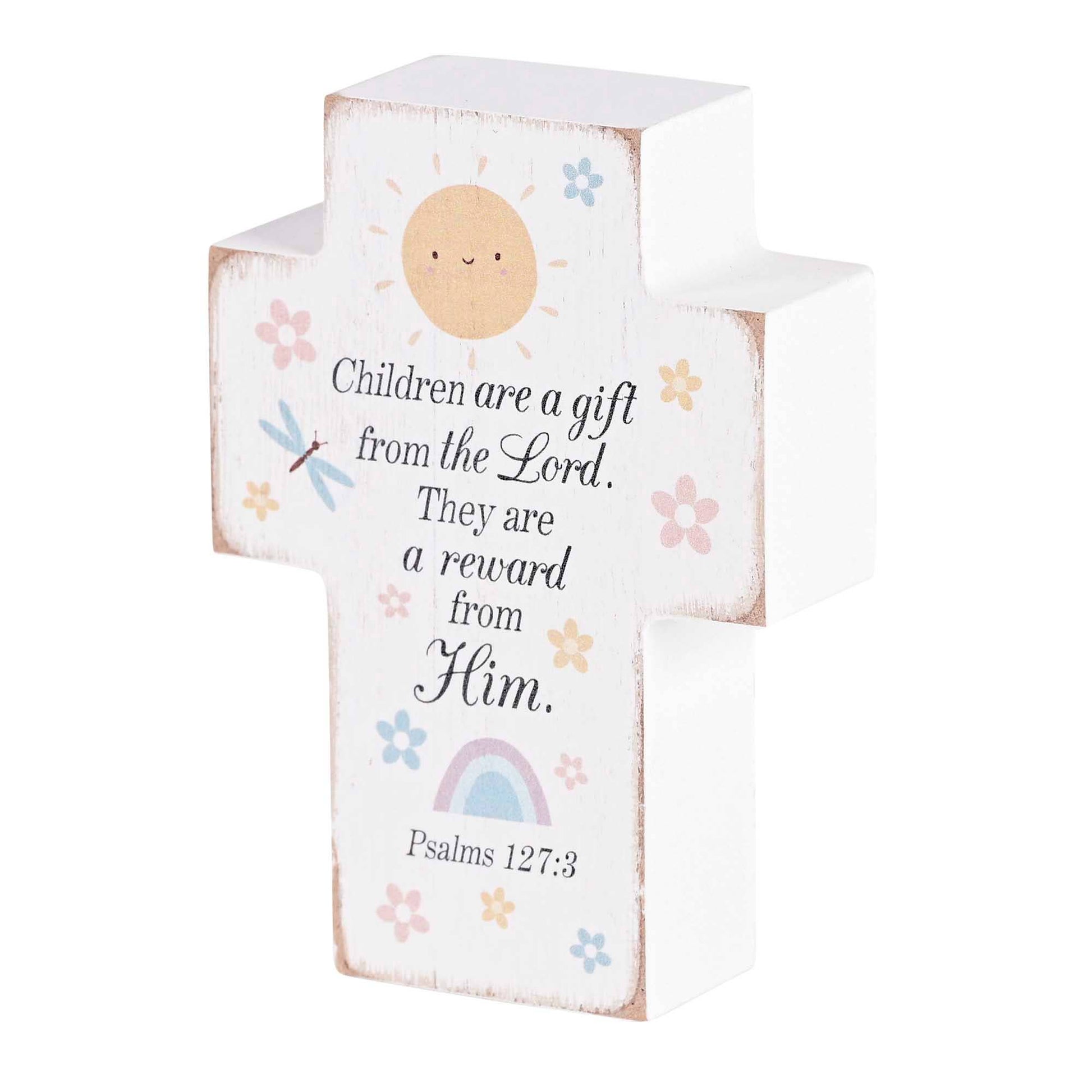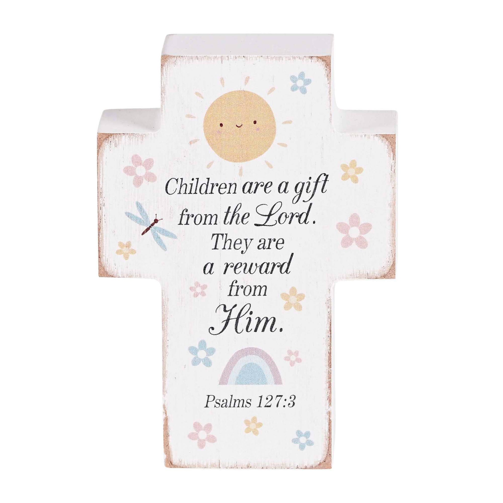 This Small Tabletop Cross Plaque Features A Whimsical Background With Psalm 127:3. Cross Plaque Is 3 x 1-1/2 x 4 And Can Sit On Tabletop. Cross Plaque Is Solid With White Distressed Finish; Made Of MDF Wood. Scripture: Children Are A Gift From The Lord. They Are A Reward From Him.