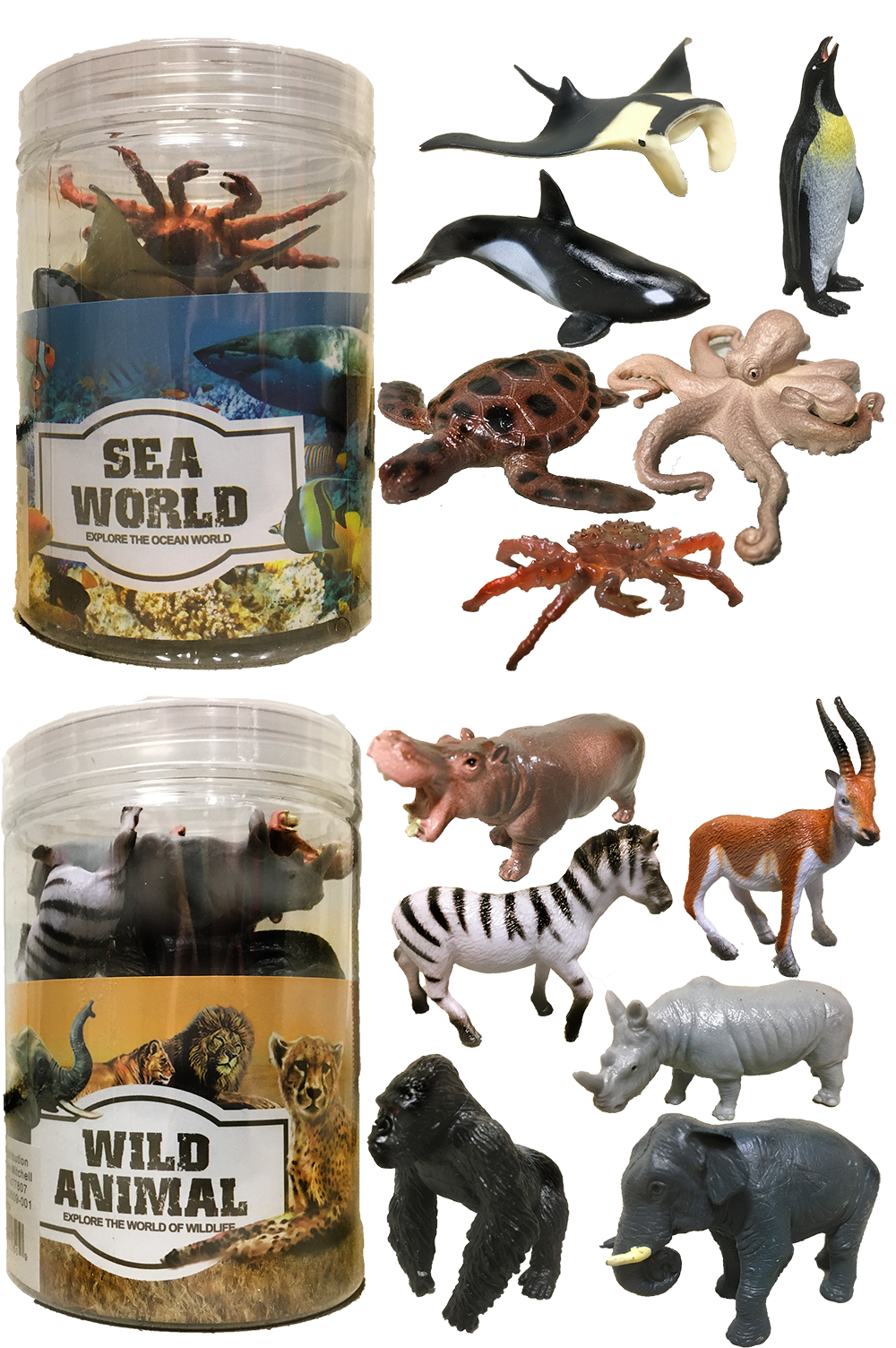 These two collections of Wild Animal and Sea World figurines is perfect for young animal fans! Comes in a plastic container with screw lid, x1 of each animal in container.